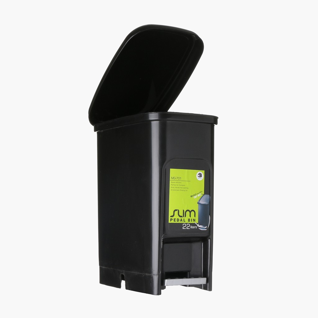 A plastic inner trash bucket is fully removable for easy emptying and cleaning.
